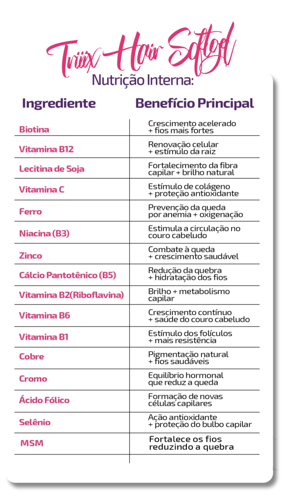 É a combinação do Triiix Hair, suplemento em cápsulas de alta absorção que nutre de dentro pra fora, com o Nutrição Absoluta, sérum capilar noturno que regenera e hidrata de fora pra dentro. Juntos, fortalecem cabelos, pele e unhas, reduzem a queda, preenchem falhas, melhoram a elasticidade e deixam os fios com brilho de salão.